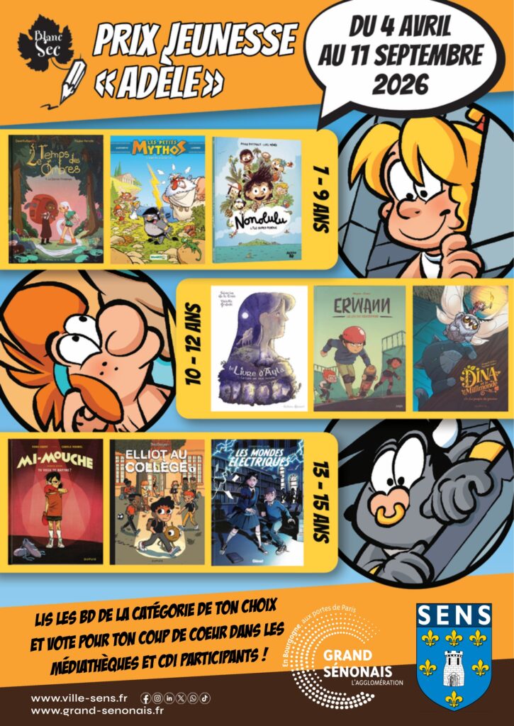 Il s’agit d’un concours de lecture qui se déroule dans différentes structures de l’agglomération du Grand Sénonais (médiathèques, établissements scolaires…) du 4 avril au 11 septembre 2026. Trois catégories allant de 7 à 15 ans vous sont proposées, avec pour objectif de voter pour votre titre préféré ! Les résultats seront annoncés le samedi 12 septembre à 18h, lors du festival de BD Blanc Sec qui se tiendra sous le marché couvert.